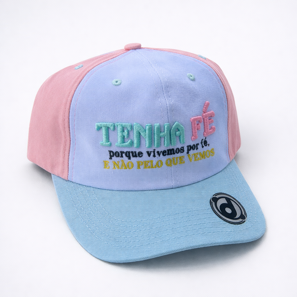 Boné bicolor com bordado “Tenha Fé” e frase complementar inspiradora. A mensagem reforça a importância de confiar em Deus mesmo quando não entendemos as circunstâncias. Representa esperança, confiança e dependência do Senhor.